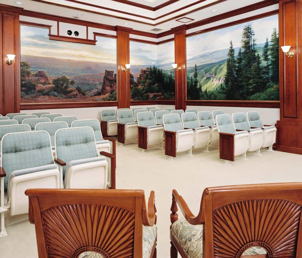 Another element of the temple is a mural in one of the ordinance rooms, painted by Native American artist Linda Turley-Christensen. On three walls she represented the varying landscapes included in the temple district from red sandstone cliffs to pine-covered mountains in vivid detail.”