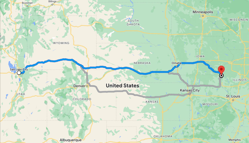 We started in Northern Utah and ending in Nauvoo. We made a lot of stops on the way from Utah to Nauvoo, trying to see as many places as possible, but when we left Nauvoo and headed home, we drove straight back to Utah, with only stops for gas and sleep.