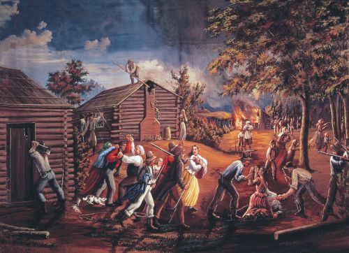 On October 31, 1833 the Missouri mob unroofed and partially destroyed ten houses of member of the Church in the Big Blue River Township. They took Latter-Day Saints men and whipped them. On November 4 the Missouri mob men started destroying houses along the Big Blue River. The Latter-Day Saint men started defending themselves and a war broke out between the two sides. The war is referred to as “Battle of the Big Blue.” Men on both sides died, two mob men and one Latter-Day Saint died in the battle.