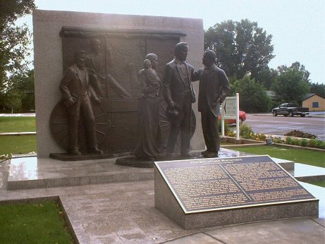 This monument depicts a Jesse N. Smith standing by a wagon that seats Ira Hinckley, the same Ira Hinckley that helped build Cove Fort, and Gordon B. Hinckley's grandfather. Also, depicted in the monument are Erastus Snow, William J. Flake and Lucy Flake holding her daughter Roberta.