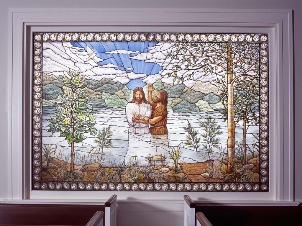 “I was finishing up the window late into the night (until about 1 a.m.) in order to meet the final deadline. Throughout the project I have had many helpers and volunteers, and many were there that night (about 15 of them). We had built two special tables on hinges to enable us to turn the window over from front to back. We would screw the tables together with the window between them like a sandwich. This particular time was the last time it was going to be turned in order to attach the steel support structure. Someone accidentally screwed the outside perimeter of the window to the table. So, when we flipped the table over and six of us lifted up the top table, I heard cracking. When I looked under the top board, the window was fastened to the board along the edges and the middle was bowing at least nine inches. Anyone who knows anything about stained glass knows how fragile it is, and you try and keep it from moving even one quarter inch let alone nine inches! I told them to hurry and put the board down, which they did. The room was deadly quiet. The look on everyone’s face was shock. I felt like I was about to faint. I told them to screw the two boards back together and flip it back I had to leave. I left the studio and walked out into a field. I'll never forget looking out at the millions of stars and feeling that we had just ruined a window which took over a year to make. I pled from every fiber of my being to God that if there was some way that the baptistery window could be ok to please help us. I had been working 90 hours a week for months and I could not do anymore. I had given all the strength I had to reach this point in the project and asked him desperately for his help now. I walked back in. It was so quiet; I don't think anybody was even breathing. We unscrewed the two boards hoping for a miracle but fearing the worst.