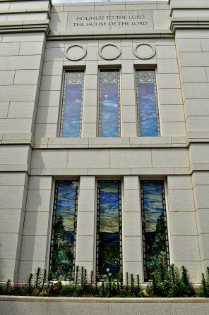 Even at the entrance of the Temple the windows have symbolic meaning, the Church news said: ”The scriptural allusion in the temple's windows is present immediately as one enters. The window behind the recommend desk features a river with seven trees adjacent to it, symbolic of seven gospel dispensations in the history of the world. The river alludes to Psalm 1:3, which speaks of a righteous man who is "like a tree planted by the rivers of water, that bringeth forth his fruit in his season; his leaf shall also not wither; and whatsoever he doeth shall prosper."